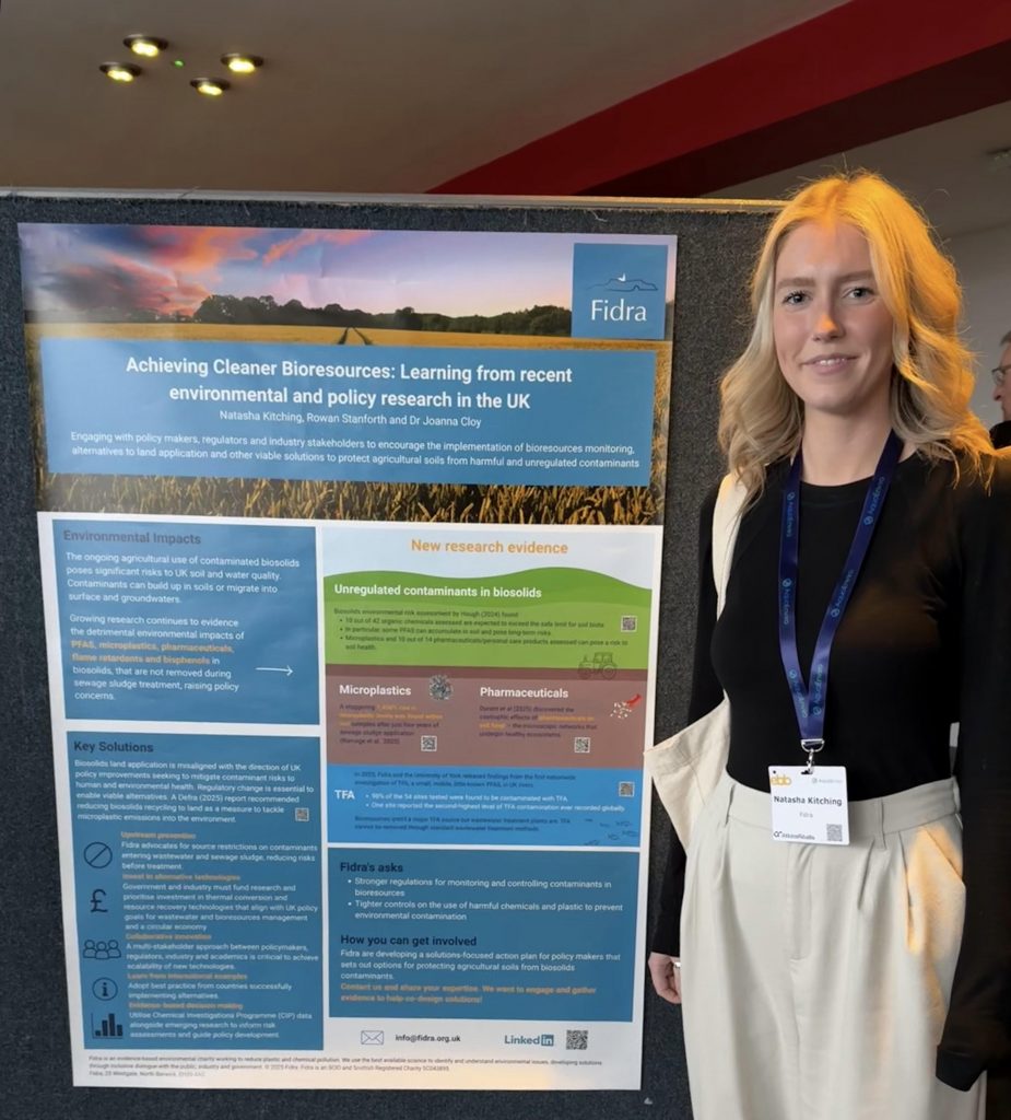 This month, our Sewage Free Soils team at Fidra attended the 30th European Biosolids and Bioresources Conference in Manchester, where we joined water industry professionals, consultants, and academics to discuss the future of biosolids management. It was an opportunity to celebrate new technologies for contaminant removal, discuss increased resilience, alternative outlets and routes for resource recovery, and to highlight the knowledge gaps and action needed to  protect the UK’s agricultural soils from contaminated bioresources.